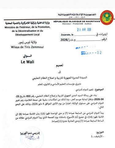 إنطلقت صباح اليوم الإثنين 27 أبريل 2026م بمدينة ازويرات، ورشة تكوينية لصالح منظمات المجتمع المدني بولاية تيرس زمور، الورشة منظمة من طرف مفوضية حقوق الإنسان والعمل الإنساني والعلاقات مع المجتمع المدني.