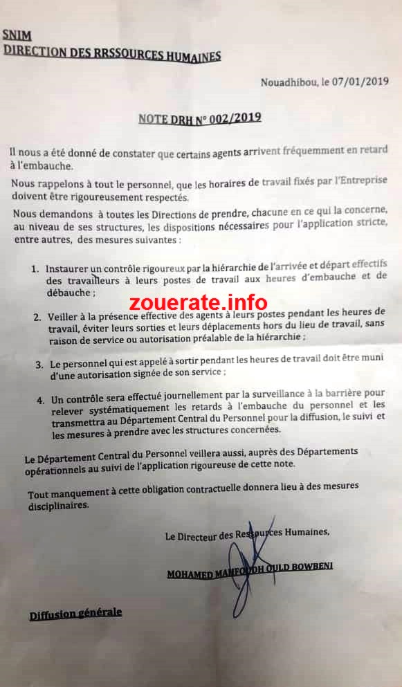 أصدرت شركة اسنيم ممثلة في مدير المصادر البشرية اليوم الإثنين مذكرة إلى مختلف الإدارات والمصالح في الشركة تحثهم فيها على الصرامة في متابعة حضور العمال في منشىآت العمل.