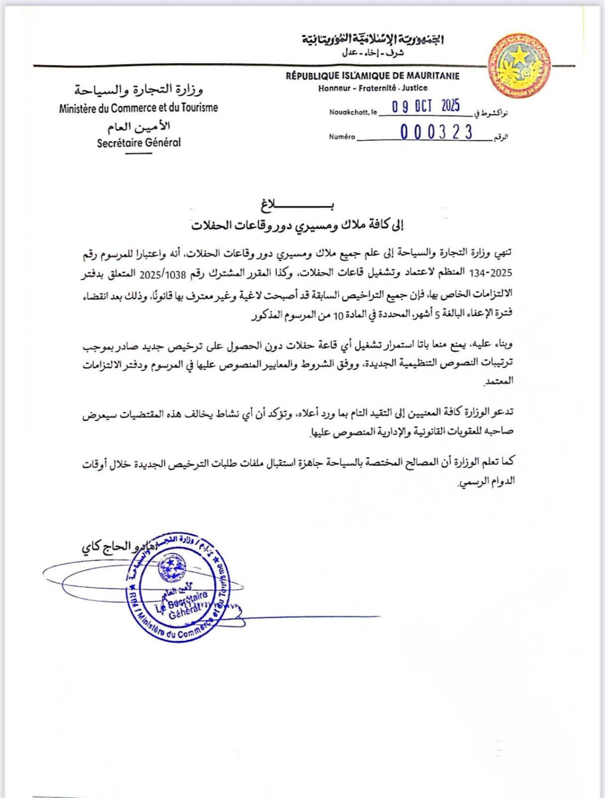 أعلنت وزارة التجارة والسياحة أن جميع تراخيص اعتماد وتشغيل قاعات الحفلات أصبحت لاغية، وغير معترف بها قانونا، وذلك بعد انتهاء فترة الإعفاء البالغة 5 أشهر، والتي منحت لهم بموجب المادة: 10 من المرسوم رقم: 134 – 2025.
