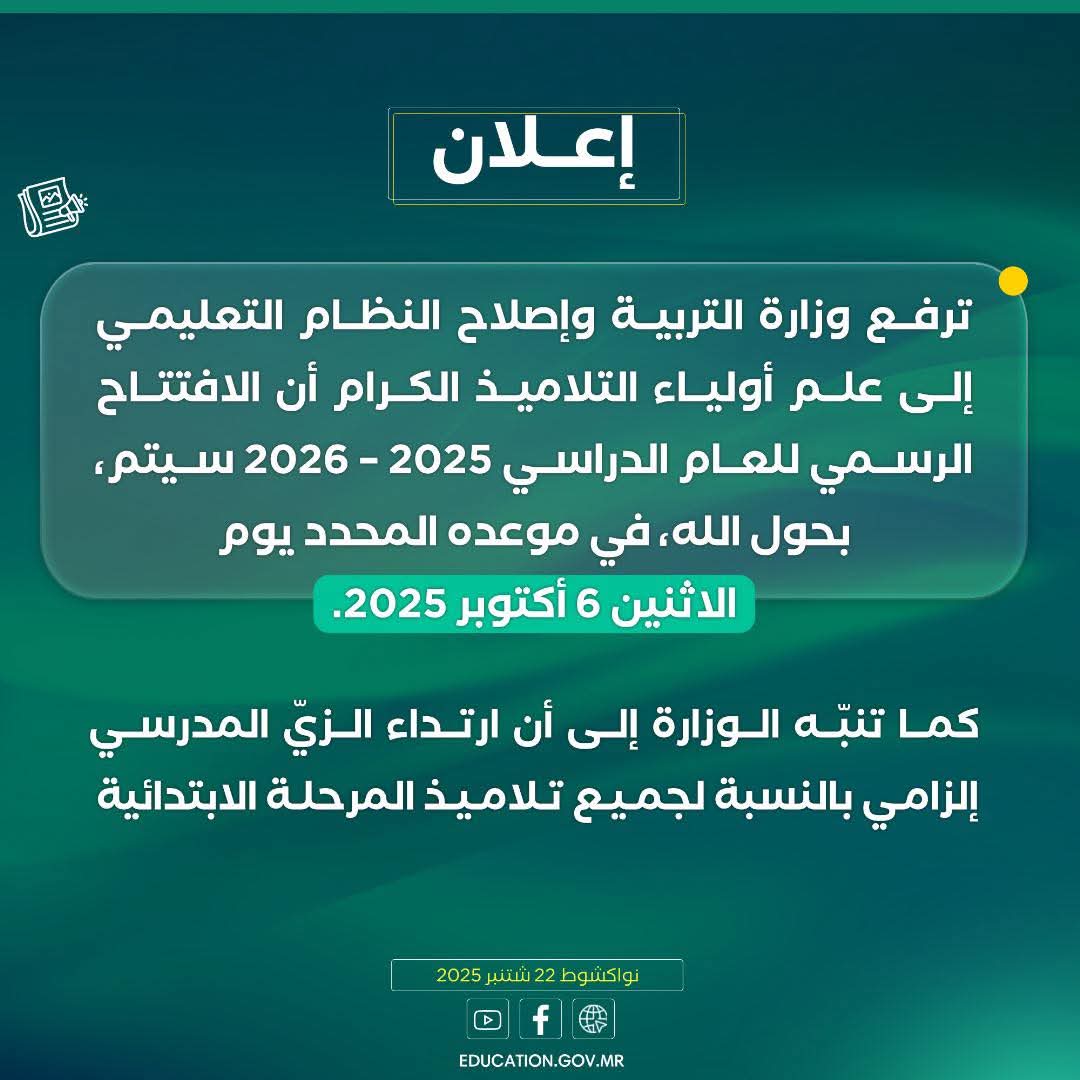 أكدت وزارة التربية وإصلاح النظام التعليمي أن الافتتاح الرسمي للعام الدراسي 2025 – 2026 سيكون في موعده المحدد يوم الإثنين 6 أكتوبر 2025.