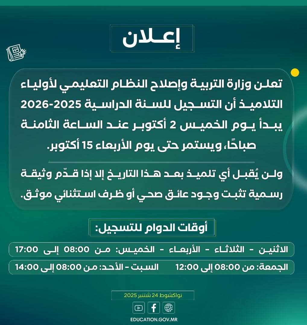 قالت وزارة التربية إن التسجيل للسنة الدراسية 2025-2026 سيبدأ يوم الخميس المقبل الموافق للثاني أكتوبر عند الساعة الثامنة صباحًا.