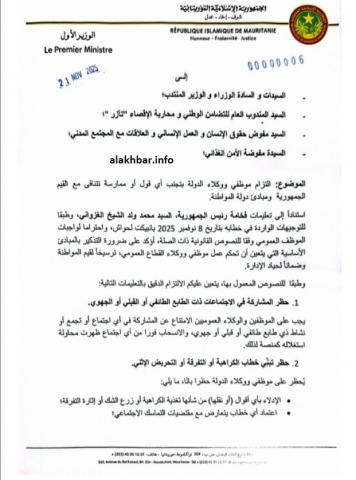 أصدر الوزير الأول المختار ولد أجاي تعميمًا إداريًا موجّهًا لأعضاء الحكومة وجميع مؤسسات الدولة، يقضي بمنع الموظفين والوكلاء العموميين من المشاركة في أي تجمعات تحمل طابعًا قبليًا أو فئوياً، مع إلزامهم بالانسحاب فورًا من أي اجتماع تظهر فيه مؤشرات على استغلال الانتماء القبلي أو التحريض على الولاءات العرقية أو الجهوية.
