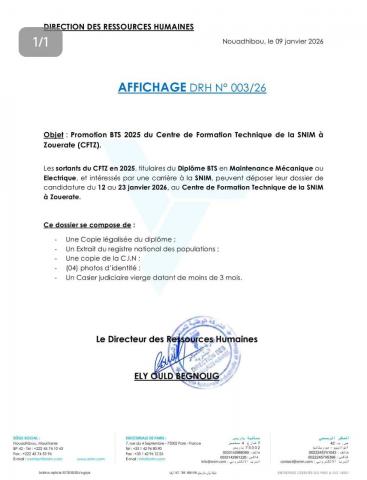 أعلنت إدارة المصادر البشرية في الشركة الوطنية للصناعة والمناجم اسنيم، عن فتح باب الترشح لخريجي مركز التكوين التقني ب ازويرات الراغبين في الإكتتاب بالشركة و الحاصلين على شهادة فني عالي BTS في الصيانة الميكانيكية والكهربائية لعام 2025م.