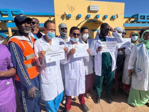 نظم عمال وموظفي مركز الإستطباب بمدينة ازويرات صباح اليوم الإثنين 2 فبراير 2026م وقفة إحتجاجية أمام مركز الإستطباب.
