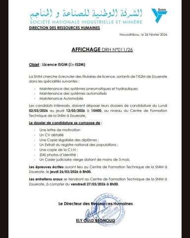أعلنت الشركة الوطنية للصناعة والمناجم اسنيم عن اكتتاب خاص بالطلاب خريجي المعهد العالي لمهن المعادن ب ازويرات.