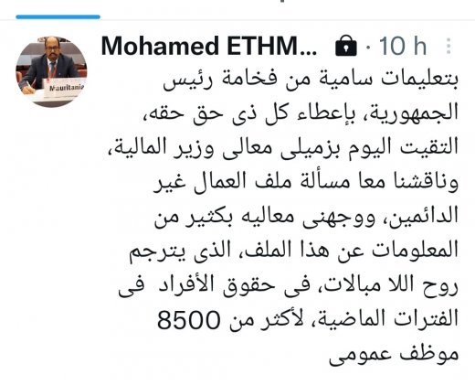 قال وزيرالوظيفة العمومية والعمل محمد ولد عبد الله ولد عثمان إنه اطلع على الكثير من المعلومات المتعلقة بملف العمال غير الدائمين "يترجم روح اللامبالاة في الفترة الماضية".